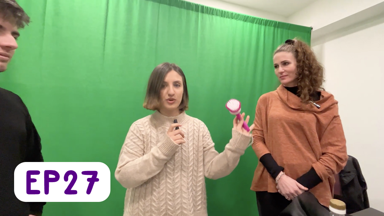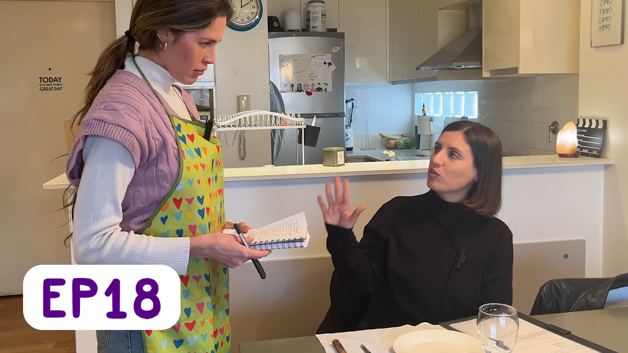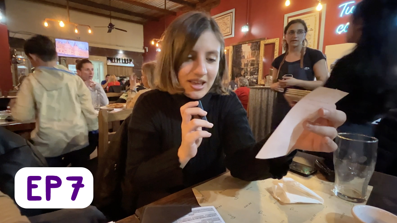 Justina and I design a vegan restaurant and role-play as waitresses (mozas) and customers with Fausto.